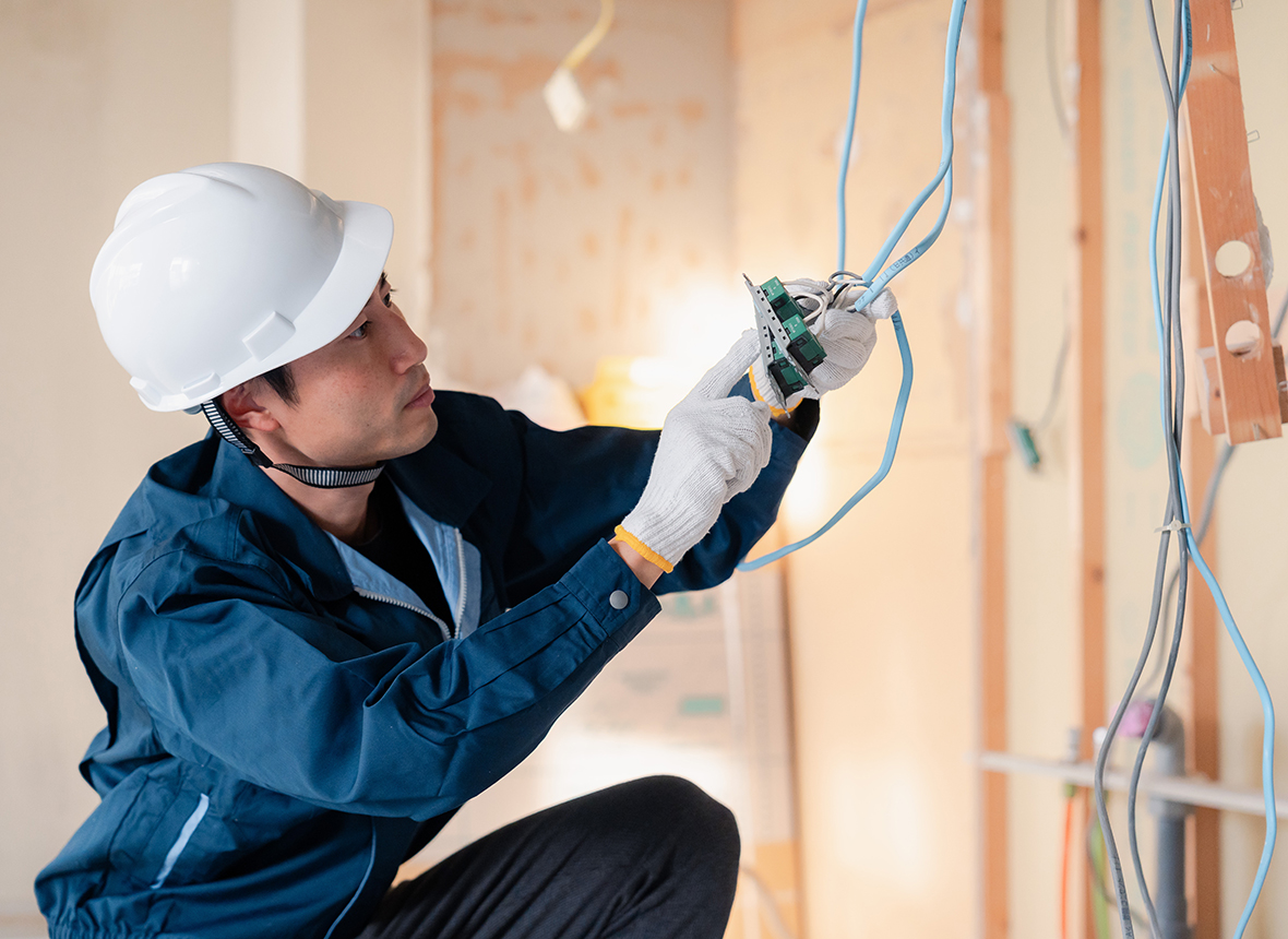 商業施設や病院、学校などあらゆる建設物の新築工事には欠かせない、受配電設備・防災設備の設置から、分電盤やコンセントなどの電気配線まで、電気に関する工事全般を請け負っています。そして、引き続き保守点検や故障対応も万全の体制を整えています。